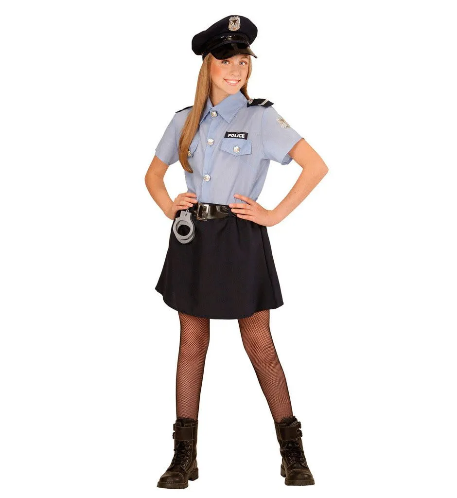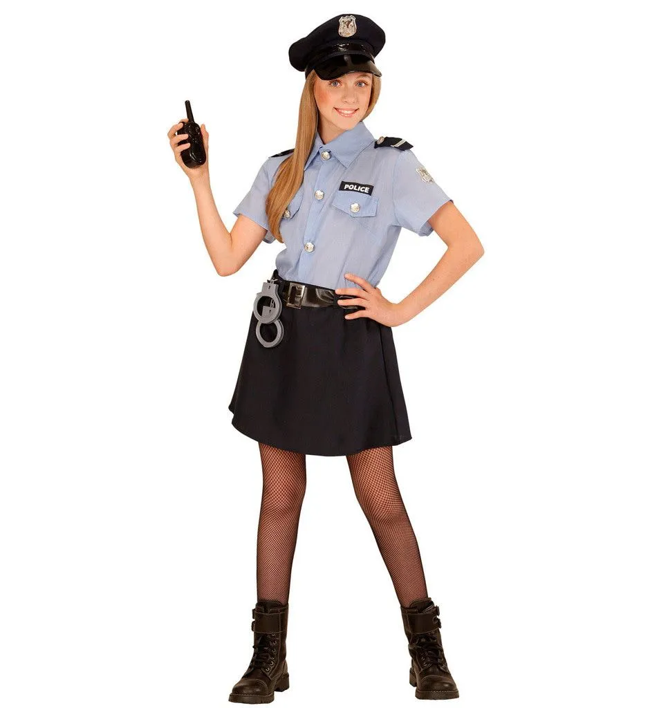 Brave meisjes blijven thuis en dappere meisjes in politie uniform komen overal. In jouw blauwe politiemeisjes kostuum pak je de ene na de andere boef op. In de boeien en achter de tralies ermee. Terwijl je dat doet zie je er ook nog supercool uit in je donkerblauwe rokje, politiepet op je hoofd en lichtblauwe shirtje met verdiende strepen op de schouder. Aan de riem kan je onmisbare accessoires hangen zoals handboeien en een wapen. Zo heb je alles bij je om zware criminelen achter slot en grendel te zetten.