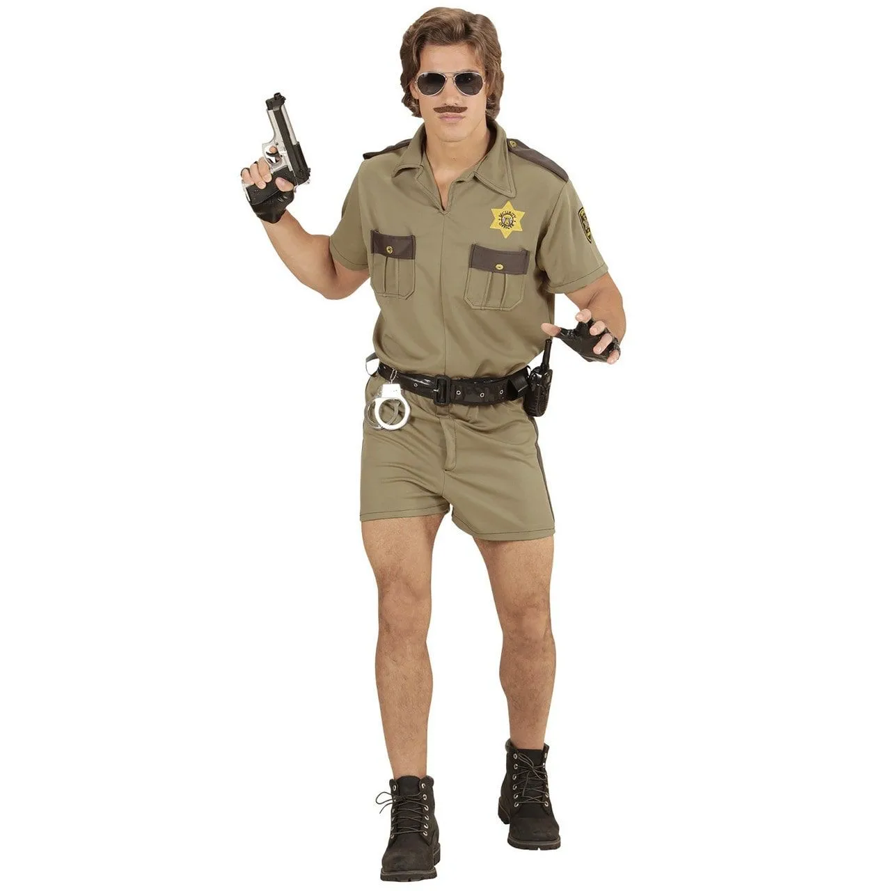 Onder je vrienden ben jij de lolbroek en een jaren 80 & 90 feest met fout thema laat jij zeker niet aan je neus voorbij gaan. Dit bruine highway politiepak zal je de nodige aandacht opleveren, je dansmoves doen dat trouwens ook! Ach, in je bruine shorts en shirt met sheriff ster kom ermee weg. Aan je riem hang je geen wapen als accessoire maar een lekker borreltje , een paar handboeien konden nog wel eens van pas komen want met je nepsnor en matje in je nek ben je een echte chick-magnet en zo’n mooie meid verdient het om gearresteerd te worden.